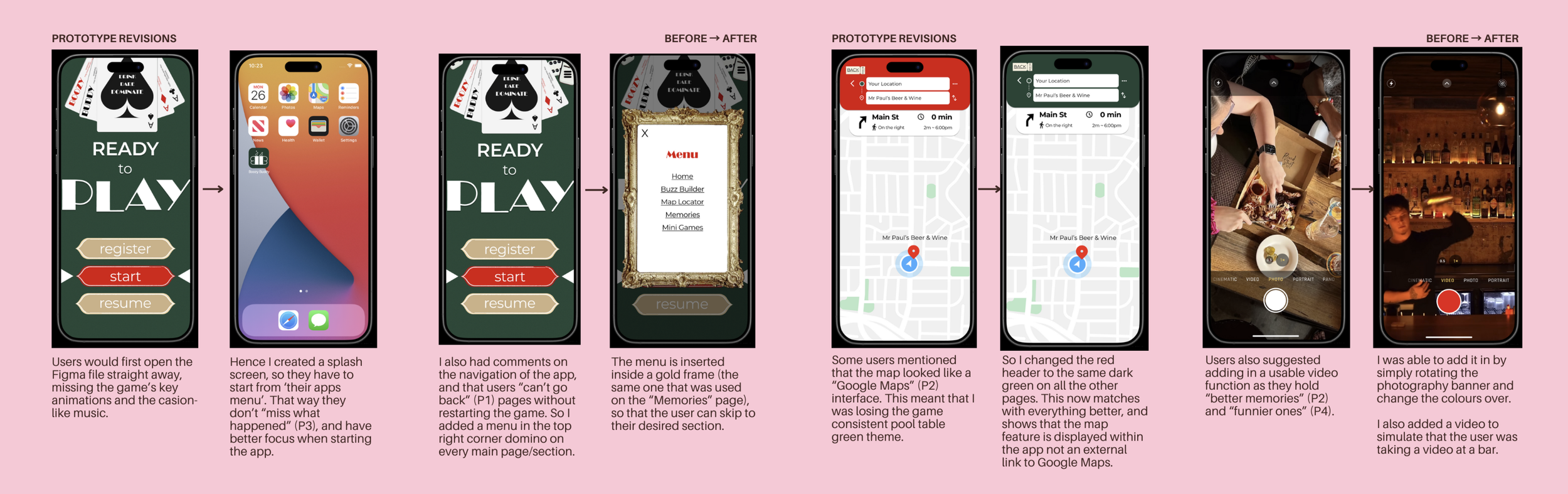 Through multiple vigorous user tests, I was able to develop three different versions of Boozy Buddy. Meaning that by repeatedly reporting back to test participants, I was able to create a seamless and enjoyable mobile game experience. The field test highlighted the first round of issues and inconveniences with the interface (which I improved).